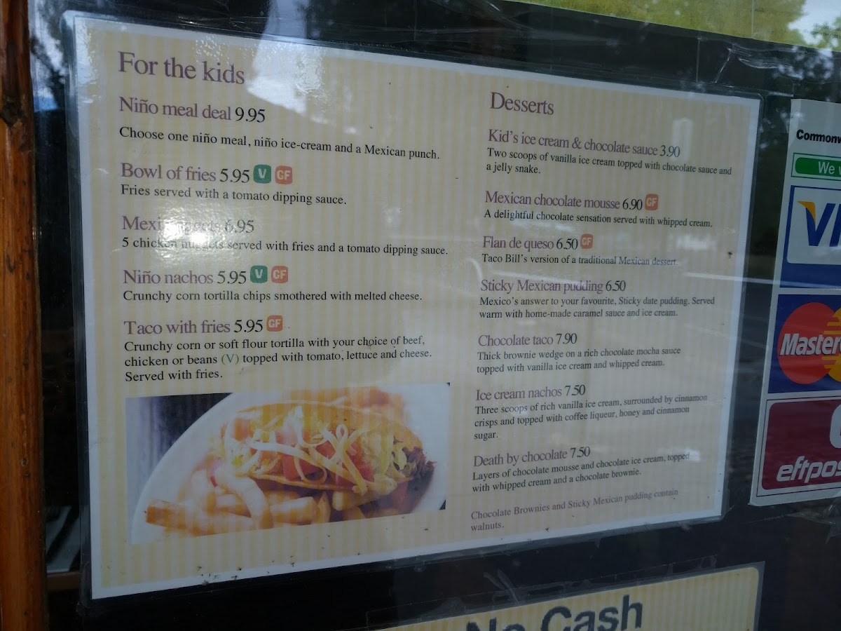 From a reviewer’s perspective, the menu at Taco Bill - Lilydale delivers a well-rounded snapshot of classic Tex-Mex comfort food with enough variety to suit different tastes and appetites. The experience is nicely framed by flavorful Starters like Popcorn Prawns, Nachos Supremos, Stuffed Jalapeños, Chargrilled Corn, and Delgada, which set the tone for the heartier dishes to follow. The Mains section is broad and satisfying, featuring crowd-pleasers such as Fajitas, Fajita Salad, Burrito Bowl, Burritos, and the indulgent Quesadilla Suprema, all designed to balance freshness with bold seasoning. Taco lovers are well catered for with options like the Street Style Chicken Taco, Herbed Chicken Taco, Frijoles Taco, Street Style Carne Colorado Taco, and Shredded Beef Taco, each offering a distinct filling and flavor profile. For those looking for value and convenience, the Meal Deals-including the Enchilada & Nacho Pack, Fajita & Nacho Pack, and Nacho & Taco Pack-bring together popular items into easy, satisfying combinations. The menu is further rounded out by comforting Enchiladas De La Casa such as Enchilada Grande, Herbed Chicken Enchilada, Enchilada Nuevo Mexico, Spinach And Potato Enchilada, and Shredded Beef Enchilada, alongside practical Sides like Jalapeño Chiles, Flour Tortillas, Corn Tortillas, Frijoles, and Crunchy Fries, plus a simple Side Salad for balance. To finish on a sweet note, desserts such as Mexican Chocolate And Mousse, Flan De Queso, and Sticky Mexican Pudding pair well with refreshing Beverages like Canned Drink 375ml and Soft Drink (1.25L), making the menu feel complete and thoughtfully curated from start to finish.